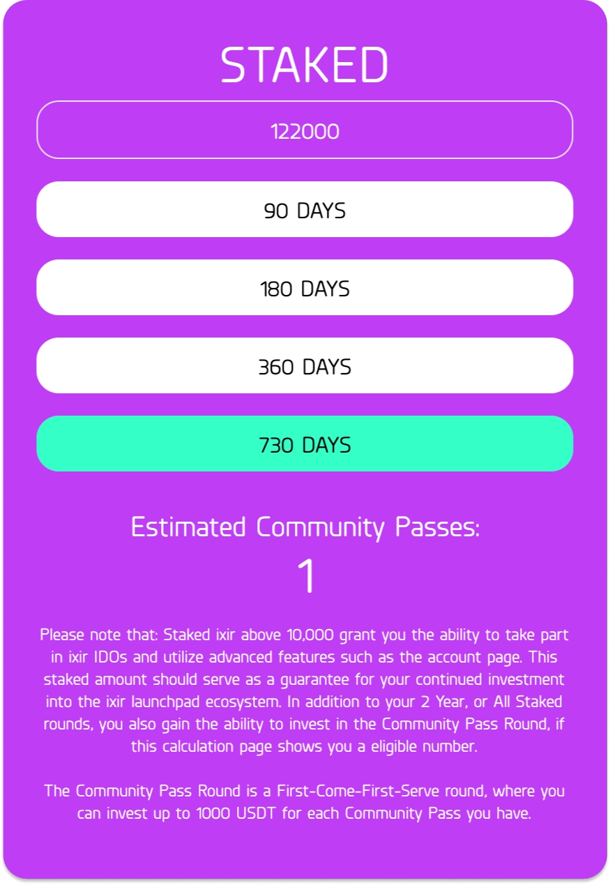 Community Pass, büyük miktarlarda stake edilmiş $IXIR tutarına sahip IXIR yatırımcılarına bir projeye yatırım yapmak için ek bi hak verir.